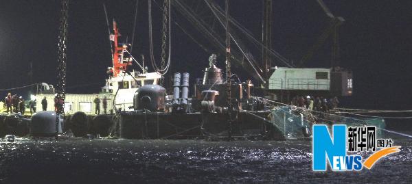 4月14日,在韩国白翎岛附近海域,韩国海军士兵及打捞队成员将“天安”号警戒舰舰尾部分用网覆盖。(资料图)