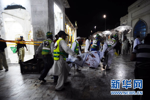 7月2日,在巴基斯坦东部城市拉合尔,救援人员从发生爆炸的圣殿内抬出一具尸体。新华社/法新