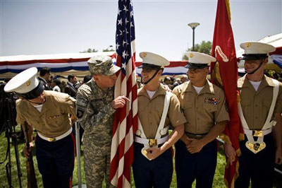 在驻阿多国部队总部外举行的就职仪式上,彼得雷乌斯接过一面美国旗和一面北约旗帜,正式接掌13万多的美国和北约驻阿富汗部队。