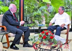 7日,古巴领导人劳尔·卡斯特罗(右)与到访的西班牙外长莫拉蒂诺举行会谈。