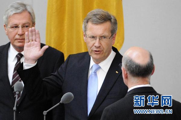 7月2日,德国新任总统武尔夫(中)在首都柏林正式宣誓就职。德国第十任总统武尔夫当日在德国联邦议院和联邦参议院全体大会上宣誓就职。这位德国历史上最年轻的总统承诺,他将致力于在社会各阶层间构筑桥梁。 新华社/法新