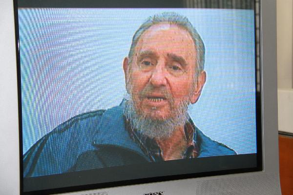 7月12日,古巴革命领导人菲德尔·卡斯特罗在哈瓦那接受古巴国家电视台“圆桌”访谈节目的直播采访,谈了他对当今朝鲜半岛和中东紧张局势的看法。 新华社记者刘彤摄