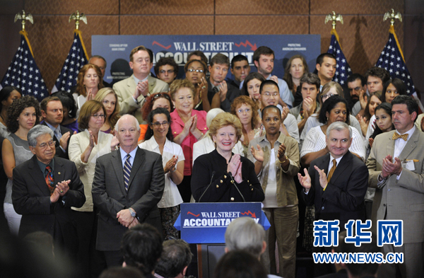 7月15日,在美国首都华盛顿国会山,参议员黛比·施塔贝诺(中)在最终版本金融监管改革法案投票后举行新闻发布会。美国国会参议院当天通过最终版本金融监管改革法案,为该法案最终成为法律清除了最后障碍。新华社记者张军摄