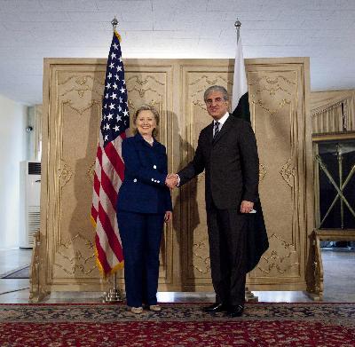 当地时间7月19日,美国国务卿希拉里与巴基斯坦外长库雷西举行会谈。