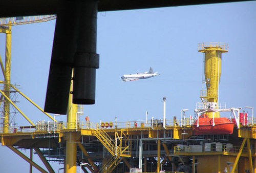 资料图:日本海上自卫队的P-3C反潜机在中国钻井平台上空低空盘旋。近年来,中日两国军舰军机和公务船只一直保持对东海油气田区域的监视。
