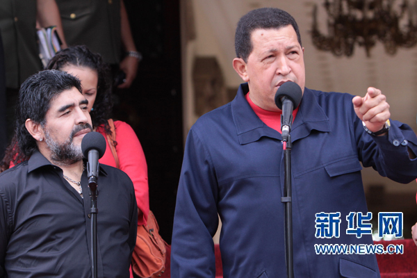 7月22日,在委内瑞拉首都加拉加斯总统府,委内瑞拉总统查韦斯(右)与阿根廷国家足球队主教练马拉多纳会面。查韦斯22日宣布与哥伦比亚断绝外交关系,以抗议哥伦比亚日前关于多名哥反政府武装头目藏身委内瑞拉的指责。查韦斯当天上午在总统府会见马拉多纳时说:“出于尊严,我们别无选择,只能断绝与哥伦比亚的外交关系。”新华社发