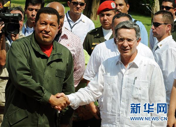 这是2009年1月24日委内瑞拉总统查韦斯(左)与哥伦比亚总统乌里韦在哥伦比亚卡塔赫纳握手。 新华社/法新