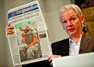 资料图片:7月26日,伦敦,“维基解密”网站创始人朱利安·阿桑奇召开新闻发布会,他手拿一份《卫报》,报上头条就是此次“泄密事件”。
