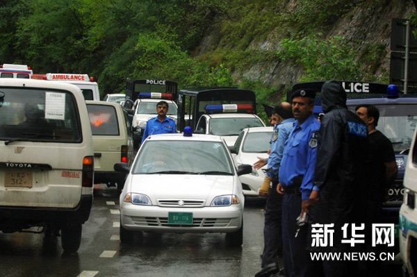 7月28日,在巴基斯坦首都伊斯兰堡附近的默尔加拉山,警方在飞机坠毁现场附近警戒。一架载有152人的客机28日上午在巴基斯坦首都伊斯兰堡附近的默尔加拉山坠毁,目前已发现5具遇难者遗体。新华社发(尼亚兹摄)