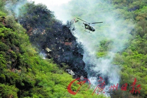 飞机发生爆炸后山中浓烟四起,一架救援直升机在山中巡逻寻找可能的生还者。(图片来源:广州日报)