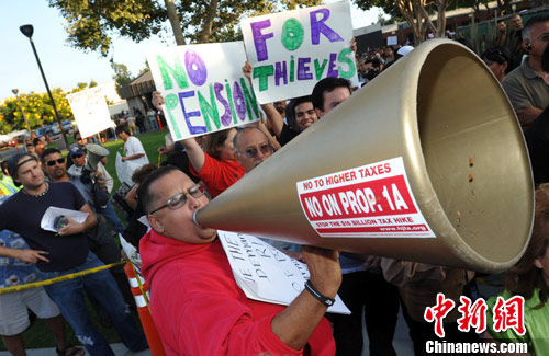 当地时间7月26日傍晚,加州贝尔市近千名市民据记载市政厅门前,抗议该市官员领取六位数年薪,要求市长和市议员辞职。中新社发 张炜 摄