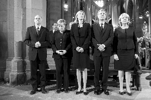 7月31日,德国杜伊斯堡,联邦议院议长拉默特(左一),总理默克尔(左二),总统武尔夫(右二)和北威州州长卡拉夫特(右一)在踩踏事故遇难者追悼仪式上。