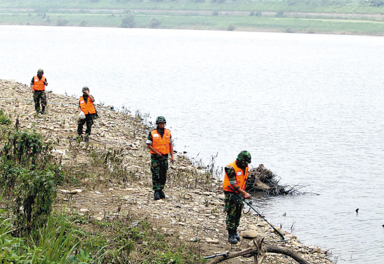 8月2日,韩国士兵在朝韩边界韩国一方搜寻被洪水冲来的地雷(羊城晚报)