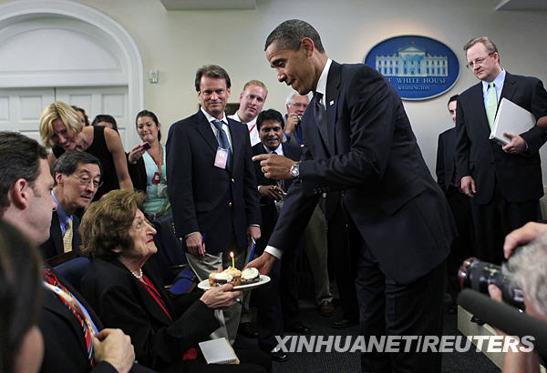 8月4日,在华盛顿白宫,美国总统奥巴马向白宫专栏作家海伦·托马斯赠送蛋糕,庆祝海伦89岁生日。新华社/路透