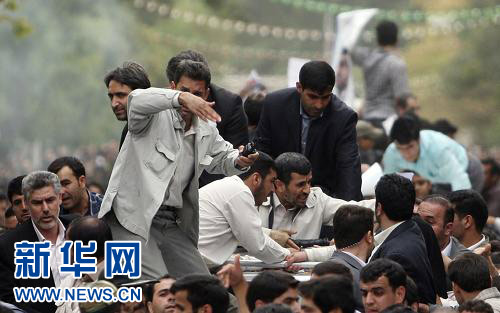 8月4日,在伊朗首都德黑兰附近的哈马丹,伊朗总统艾哈迈迪-内贾德的保镖在听到人群中发出的响声后作出反应。新华社/路透