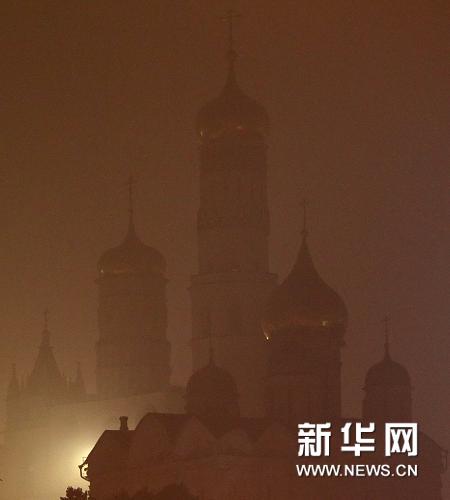 受周围森林火灾影响,莫斯科被烟雾笼罩。图为8月4日拍摄的莫斯科克里姆林宫内的教堂。