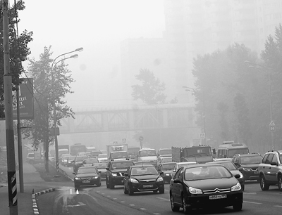 烟雾笼罩中的莫斯科街景。