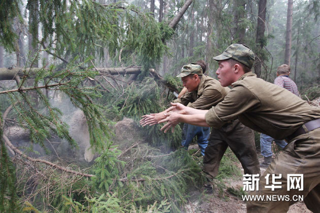 8月7日,在俄罗斯莫斯科州的奥列霍沃-祖耶沃村附近,士兵扑灭一处火点。新华社记者鲁金博摄