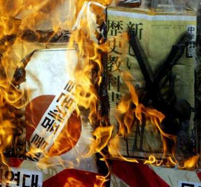 资料图片:韩国抗议者在日本驻韩国大使馆前烧毁日歪曲历史教科书。