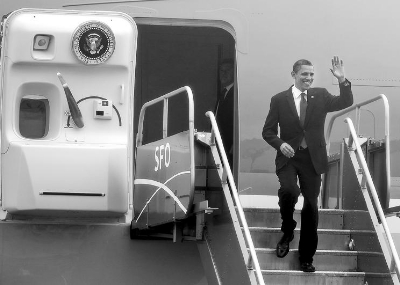 奥巴马抵达旧金山,出席民主党参议员的选举筹款活动。