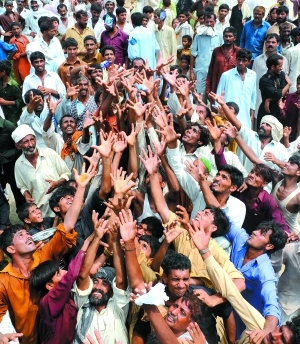 8月11日,巴基斯坦灾民等着救援飞机投下瓶装饮用水。