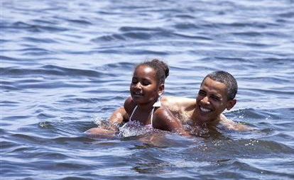 美国总统奥巴马今天赤膊上阵,与小女儿萨莎一道在佛罗里达州一处海湾游泳,以此提振因漏油事故而低迷不振的墨西哥湾沿岸的旅游人气。