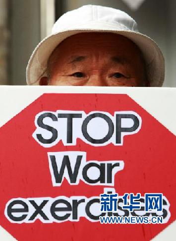 2010年8月16日 韩国民众集会反对韩美联合军演 8月16日,韩国民众在“韩美战争指挥中心”前举行集会,呼吁和平,反对韩美举行名为“乙支自由卫士”的联合军事演习。为期两周的韩美2010年度“乙支自由卫士”联合军事演习16日起在韩国境内开始举行。 新华社发(朴真熙摄)