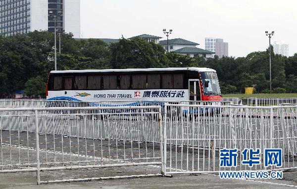 8月23日,在菲律宾首都马尼拉,被劫持的旅游观光客车停在基里诺大看台附近。新华社/路透