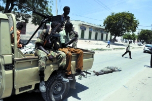8月24日,索马里摩加迪沙,政府军用卡车拖着伊斯兰武装分子的尸体。