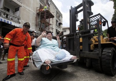 据外电报道,泰国一名妇女体重高达274公斤,是泰国最胖的妇女。她3年都呆在公寓中,足不出户。不过,26日,她在一辆铲车的帮助下,头一次离开了公寓。