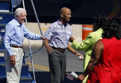 27日,美国前总统卡特与被朝鲜释放的美国公民戈麦斯返抵美国。
