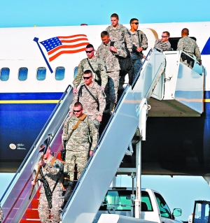 28日,又一批美国士兵乘坐军机从伊拉克战场上归来。