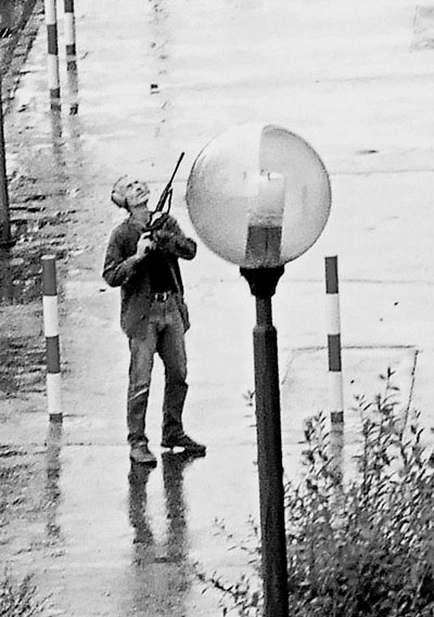 枪手戴着耳筒,在街上枪指周围楼宇。