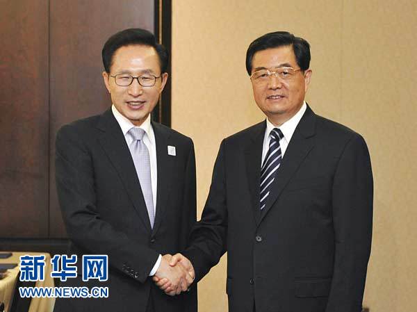 资料图:今年6月27日,中国国家主席胡锦涛在加拿大多伦多会见韩国总统李明博。新华社记者 李学仁 摄