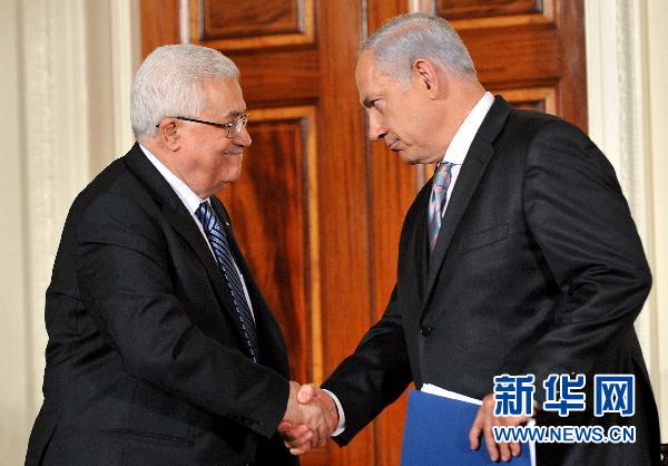 9月1日,以色列总理内塔尼亚胡(右)在美国首都华盛顿白宫与巴勒斯坦民族权力机构主席阿巴斯握手。美国总统奥巴马当天表示,在各方的努力下,以色列政府与巴勒斯坦民族权力机构将于2日在华盛顿重启中断20个月的直接谈判,双方领导人应该抓住时机,共促实现惠及中东地区人民的和平。 新华社/法新