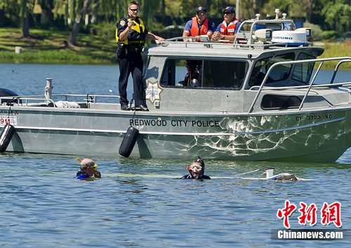 当地时间9月2日,一架刚起飞30秒的双引擎比奇65皇后小飞机近中午时分坠落在美国加州旧金山湾区中半岛的一个人工湖中。中新社发 陈钢 摄