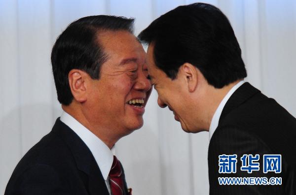 9月1日,在日本首都东京举行的联合记者会开始前,日本首相、执政的民主党代表(党首)菅直人(右)和民主党前干事长小泽一郎抵达会场。新华社记者季春鹏摄