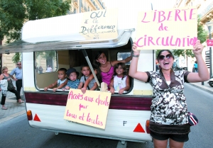 参与游行的罗姆人举着条幅,上面写着“对萨科齐的非人道政策说不”。