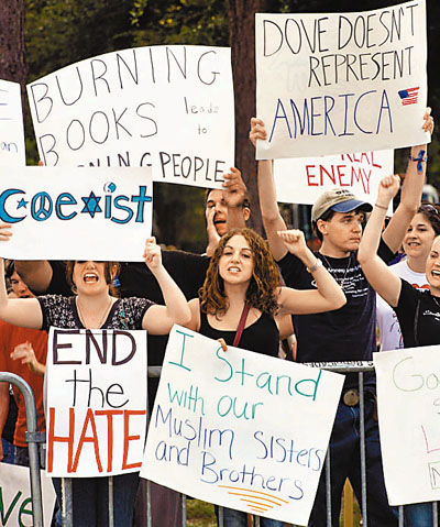 示威者在曾发起焚烧《古兰经》的牧师琼斯的教会外抗议“烧经”行为。