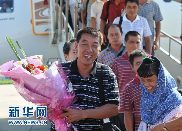 9月13日,来自福建省泉州市的李国金(前左)等走下飞机。当日15时,经过中国政府严正交涉,被日方非法抓扣的14名中国渔民乘中国政府包机安全返抵福州。新华社记者 张国俊 摄