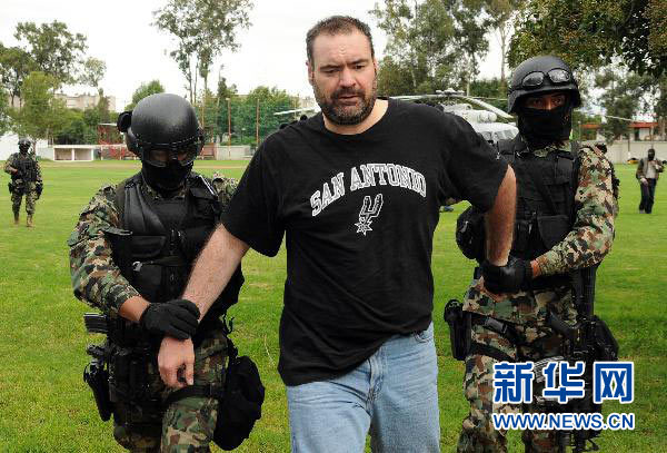 2010年9月13日,墨西哥一毒枭落网。 9月12日,在墨西哥普埃布拉市郊,墨西哥海军陆战队士兵押送被捕的毒枭塞尔希奥·比利亚雷亚尔·巴拉甘。(新华社发,鲍菲菲摄)