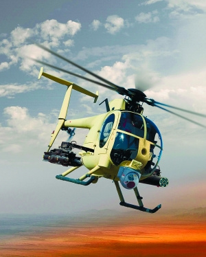 AH-6,机长:9.9米 旋翼直径:8.3米;起飞重量:1.6吨;最大速度:282公里/小时