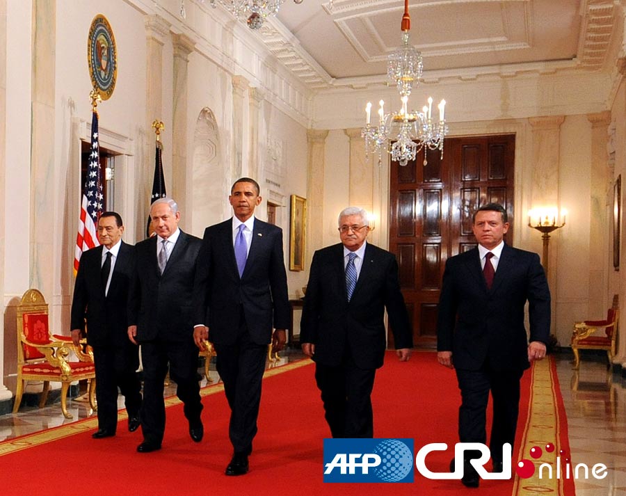 原版图片中,各国领导人由左至右分别为:埃及总统穆巴拉克、以色列总理内塔尼亚胡、美国总统奥巴马、巴勒斯坦民族权力机构主席阿巴斯、约旦国王阿卡杜拉二世。奥巴马的位置略微靠前。(AFP/国际在线)