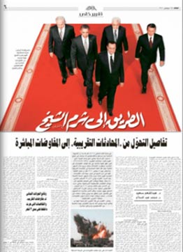 据英国广播公司(BBC)9月16日报道,埃及全国发行量最大的《金字塔报》9月14日曾以《通往沙姆沙伊赫之路》为题,公布了一张中东和谈领导人的照片。不为人知的是,这张照片是经过修改的,将埃及总统穆巴拉克的位置由最右边移至最前方,显示出穆巴拉克走在所有领导人的最前面,暗示埃及才是和谈的主导力量。