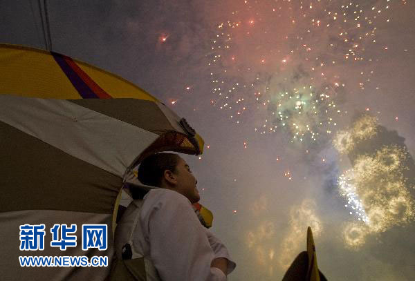 2010年9月16日,墨西哥城:五光十色欢乐夜。 9月15日,在墨西哥首都墨西哥城宪法广场举行的庆祝墨西哥独立200周年的欢庆仪式上,焰火点亮夜空。新华社记者 戴维摄