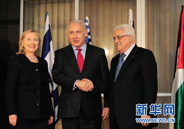 2010年9月15日,以色列总理内塔尼亚胡(中)在耶路撒冷总理官邸与美国国务卿希拉里·克林顿(左)、巴勒斯坦民族权力机构主席阿巴斯(右)会面。当日,巴勒斯坦和以色列领导人在耶路撒冷继续举行双方第二轮直接和谈,美国国务卿希拉里参加谈判。(新华社记者尹栋逊摄)