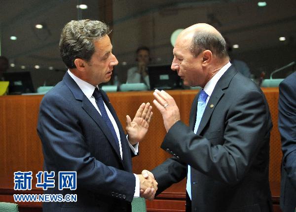 9月16日,在比利时首都布鲁塞尔的欧盟总部,法国总统萨科齐与罗马尼亚总统伯塞斯库在首脑会议现场交谈。当天,欧盟首脑会议在布鲁塞尔举行。 新华社记者武巍摄