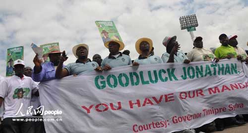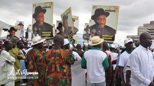 尼总统乔纳森的支持者在阿布贾雄鹰广场参加竞选集会。殷淼摄