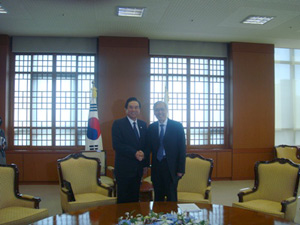 资料图:2010年4月15日,应中国驻韩国大使馆的邀请,海峡两岸关系协会会长陈云林对韩国进行访问。图为陈云林会见韩国外交通商部第一次官申珏秀。申珏秀将作为代理外长参加第65次联合国大会。