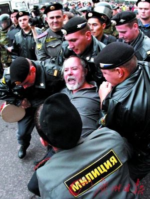 12日,一名要求卢日科夫下台的抗议者在莫斯科集会时被警察逮捕。